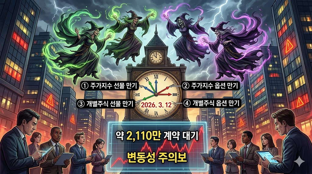2026년 3월 12일, 국내 증시에 '네 마녀의 날(쿼드러플 위칭 데이)' 주의보가 발령됐습니다. 주가지수 선물·옵션과 개별 주식 선물·옵션의 만기일이 동시에 겹치는 이날, 약 2110만 계약에 달하는 미결제약정(OI)이 청산 대기 중인 상황이라 투자자들의 경계심이 그 어느 때보다 높아진 상태입니다.