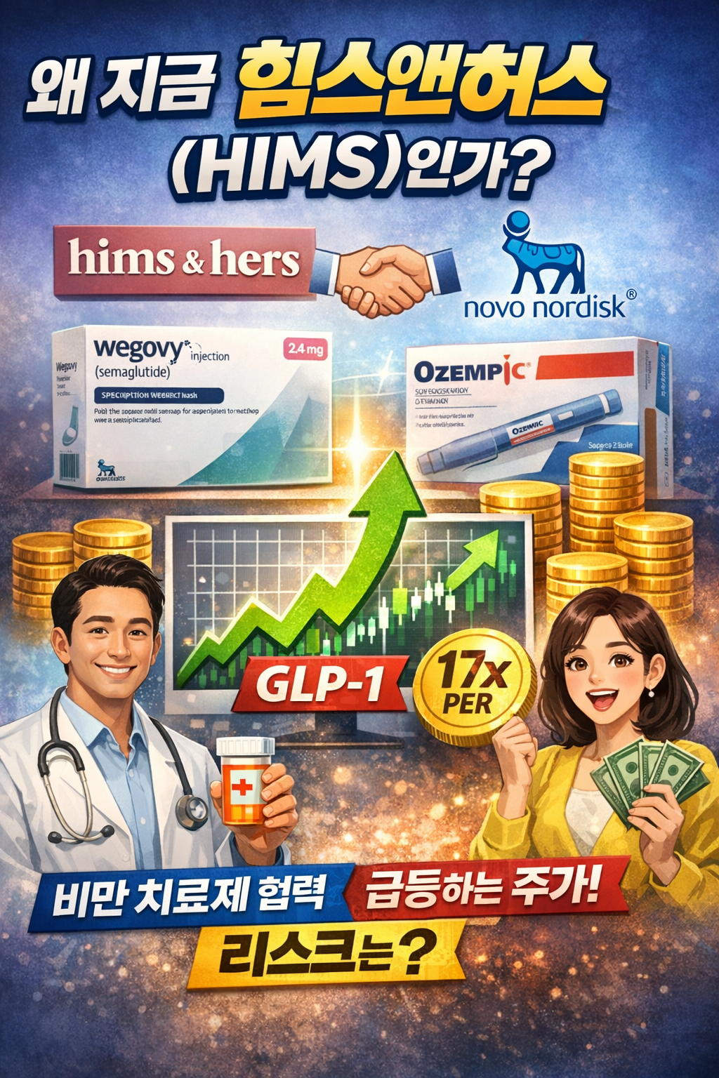 2025년, 미국 헬스케어 섹터에서 가장 뜨거운 이름 하나를 꼽으라면 단연 힘스앤허스(HIMS)입니다. 하루 사이 주가가 +10.27% 급등하며 시장의 시선을 한 몸에 받았는데요, 그 중심에는 바로 글로벌 비만 치료제 강자 노보노디스크(Novo Nordisk)와의 전격 유통 협약이 있습니다. 노보노디스크가 자사의 블록버스터 비만 치료제인 위고비(Wegovy)와 오젬픽(Ozempic)을 힘스앤허스 플랫폼을 통해 직접 판매하기로 한 것입니다. 🎉