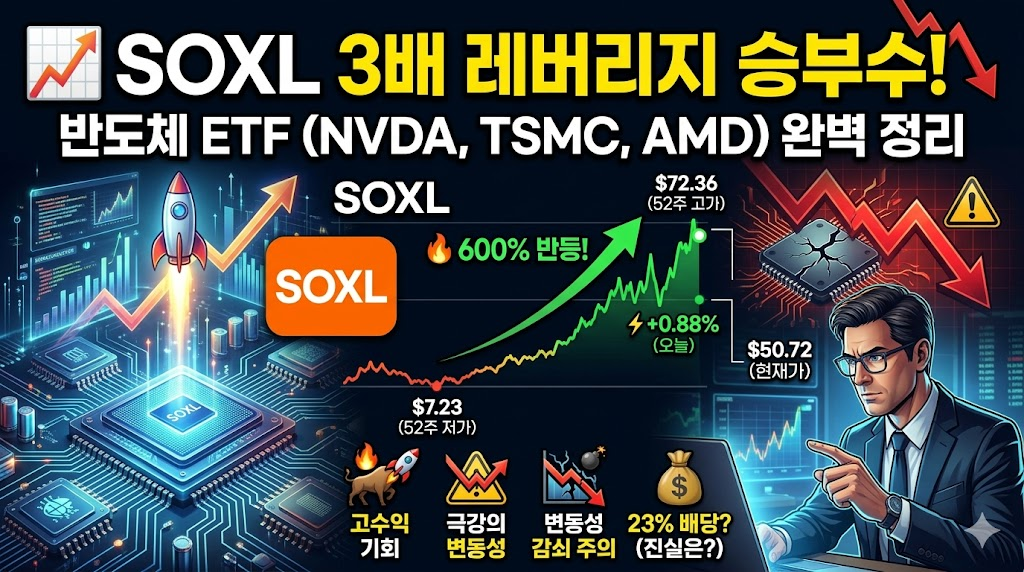 📡 요즘 반도체 섹터에 관심 있는 투자자라면 SOXL(Direxion Daily Semiconductor Bull 3X Shares)을 한 번쯤은 들어보셨을 겁니다. AI 열풍과 함께 엔비디아(NVDA), TSMC, AMD 같은 반도체 기업들이 시장의 주목을 받으면서, 이들을 3배 레버리지로 추종하는 SOXL ETF도 함께 뜨거운 관심을 받고 있죠.