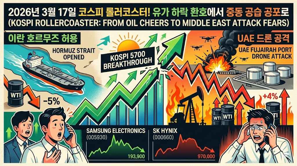 3월 17일 국내 증시는 유가와 지정학적 리스크가 얼마나 큰 영향력을 가지고 있는지 극명하게 보여준 하루였습니다. 코스피가 장 초반 5700선을 돌파하는 강세를 보였음에도 UAE 드론 공습이라는 돌발 악재 하나에 상승폭을 크게 반납한 것은, 현재 증시가 중동 리스크에 얼마나 취약하게 연동되어 있는지를 방증합니다.