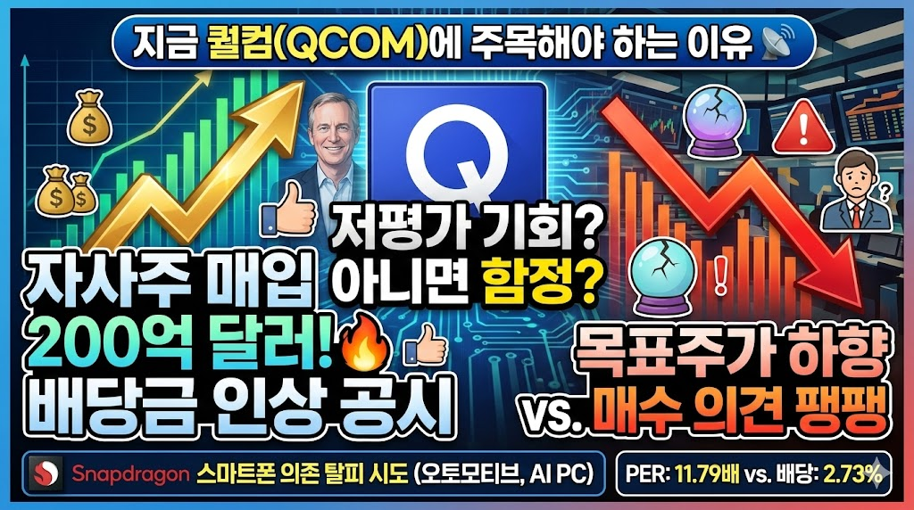 최근 퀄컴 관련 뉴스는 크게 긍정적 주주환원 재료와 애널리스트 투자의견 하향이라는 두 가지 흐름으로 나뉩니다. 이 두 가지가 동시에 등장하면서 시장에서 방향성을 놓고 팽팽한 줄다리기가 벌어지고 있습니다. 🎯