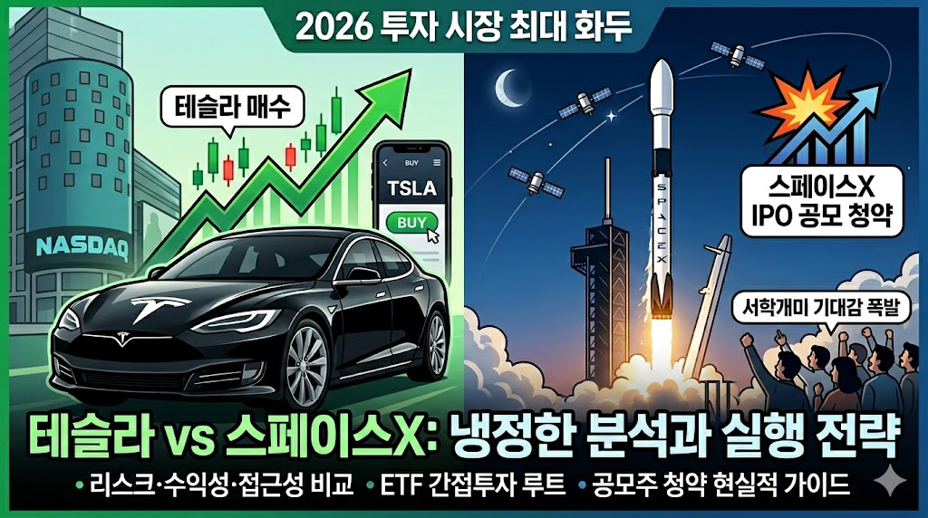 2026년 투자 시장에서 가장 뜨거운 화두 두 가지를 꼽으라면 단연 테슬라 주식 매수와 스페이스X IPO 공모 청약입니다. 이미 나스닥에 상장된 테슬라는 언제든 클릭 한 번으로 매수할 수 있는 반면, 스페이스X는 아직 비상장 상태이지만 '역대급 IPO'라는 수식어와 함께 전 세계 투자자들의 시선을 사로잡고 있습니다. 조선일보를 비롯한 주요 언론이 "테크 기업들 줄상장에 서학개미들 가슴 두근두근"이라고 표현할 만큼, 그 기대감은 이미 임계점에 달해 있습니다.