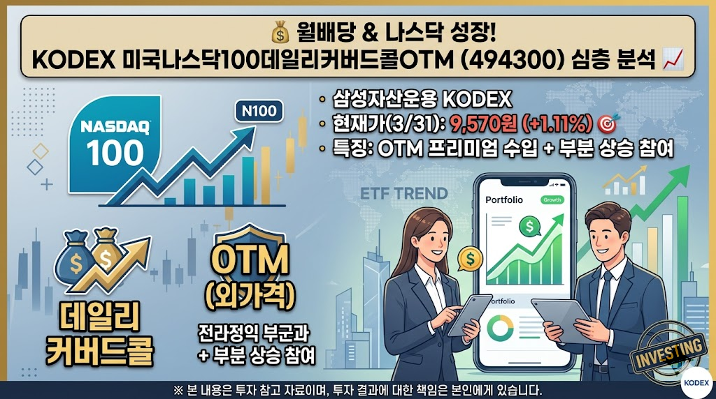 📢 요즘 고금리 시대가 길어지면서 "그냥 주가 상승만 바라보는 투자는 너무 불안하다"는 분들이 많아졌죠. 그래서인지 커버드콜 ETF에 대한 관심이 부쩍 높아졌습니다. 오늘 소개할 종목은 바로 삼성자산운용이 운용하는 KODEX 미국나스닥100데일리커버드콜OTM ETF(종목코드: 494300)입니다. 코스피 시장에 상장된 이 ETF는 2026년 3월 31일 기준 현재가 9,570원으로 전일 대비 +1.11% 상승 마감했습니다. 🎯