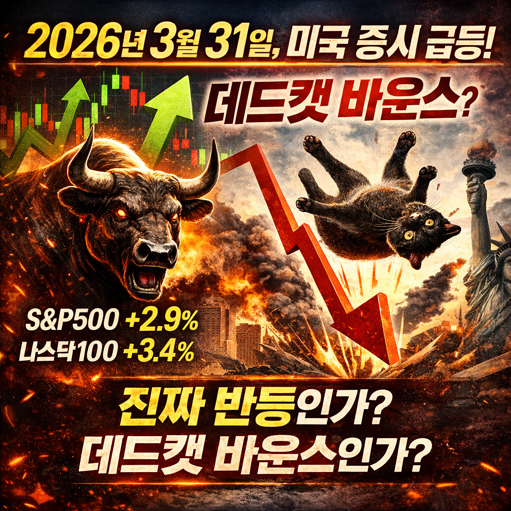 2026년 3월 31일, 미국 증시는 놀라운 반등을 연출했습니다. S&P 500이 +2.9%, 나스닥 100이 +3.4%, 다우존스 산업평균지수(DJIA)가 +2.5%, 소형주 지수인 러셀 2000이 +3.4% 상승하며 2025년 5월 이후 최고의 일일 상승률을 기록했습니다. 겉으로 보기엔 강력한 상승 신호처럼 보이지만, 시장 전문가들은 이 반등이 '데드캣 바운스(Dead Cat Bounce)'에 불과할 수 있다고 경고하고 있습니다.